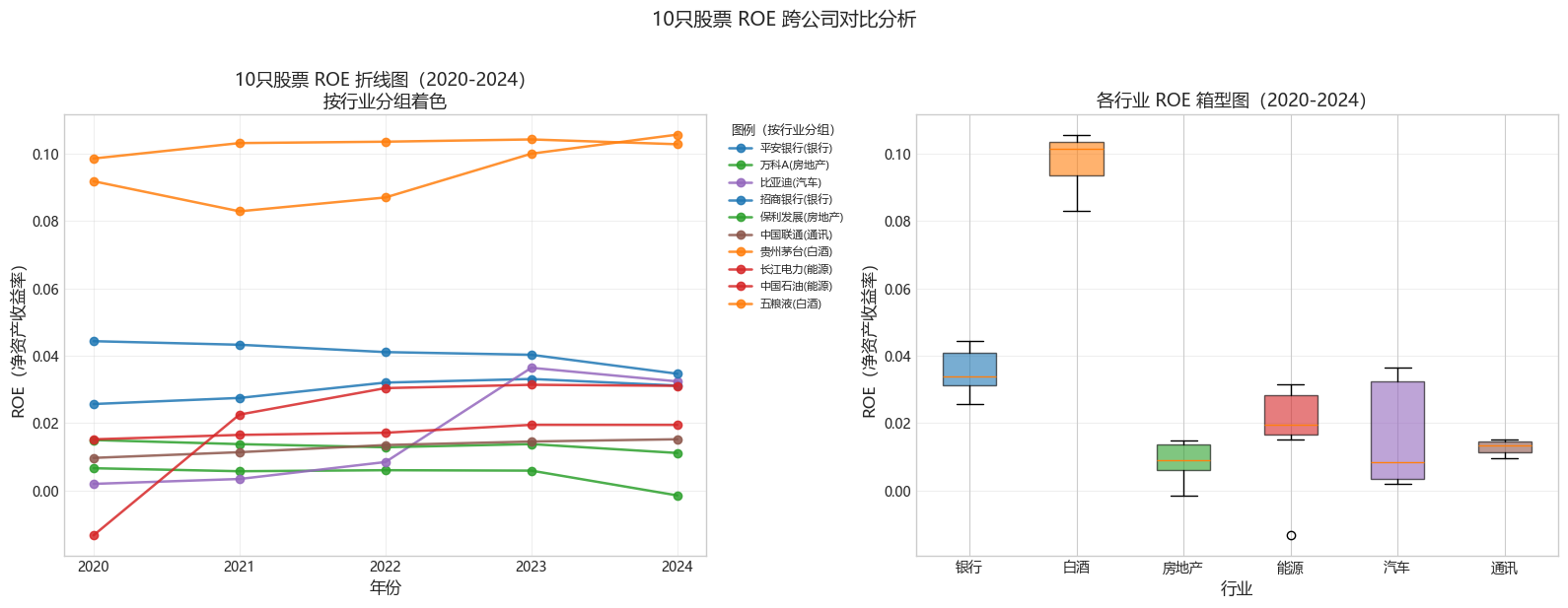ax1.set_title('10只股票 ROE 折线图(2020-2024)\n按行业分组着色', fontsize=13)