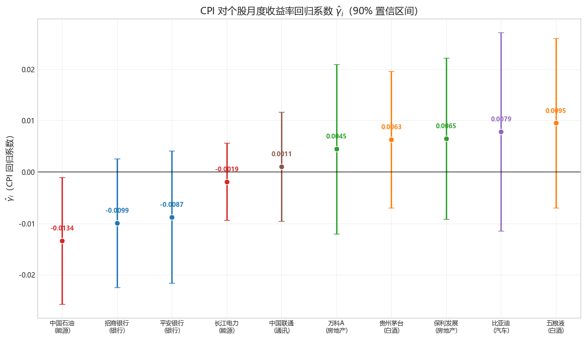 图中展示了各股CPI月度收益率回归系数\(\hat{\gamma}_i\)及90%置信区间,按行业分组着色: 1. 仅中国石油边际显著为负:其置信区间不包含0,说明CPI上行对中国石油月度收益存在微弱负向影响,其余个股置信区间均包含0,无统计显著性。 2. 行业方向分化但无统计意义:能源、银行板块\(\hat{\gamma}_i\)整体为负,白酒、汽车、地产板块为正,但仅方向差异,不具备统计显著性。 3. 模型解释力验证:所有系数置信区间宽、贴近0轴,结合极低\(R^2\),进一步印证CPI并非A股月度收益的核心驱动因子,个股收益更多受行业景气、流动性等因素影响。
